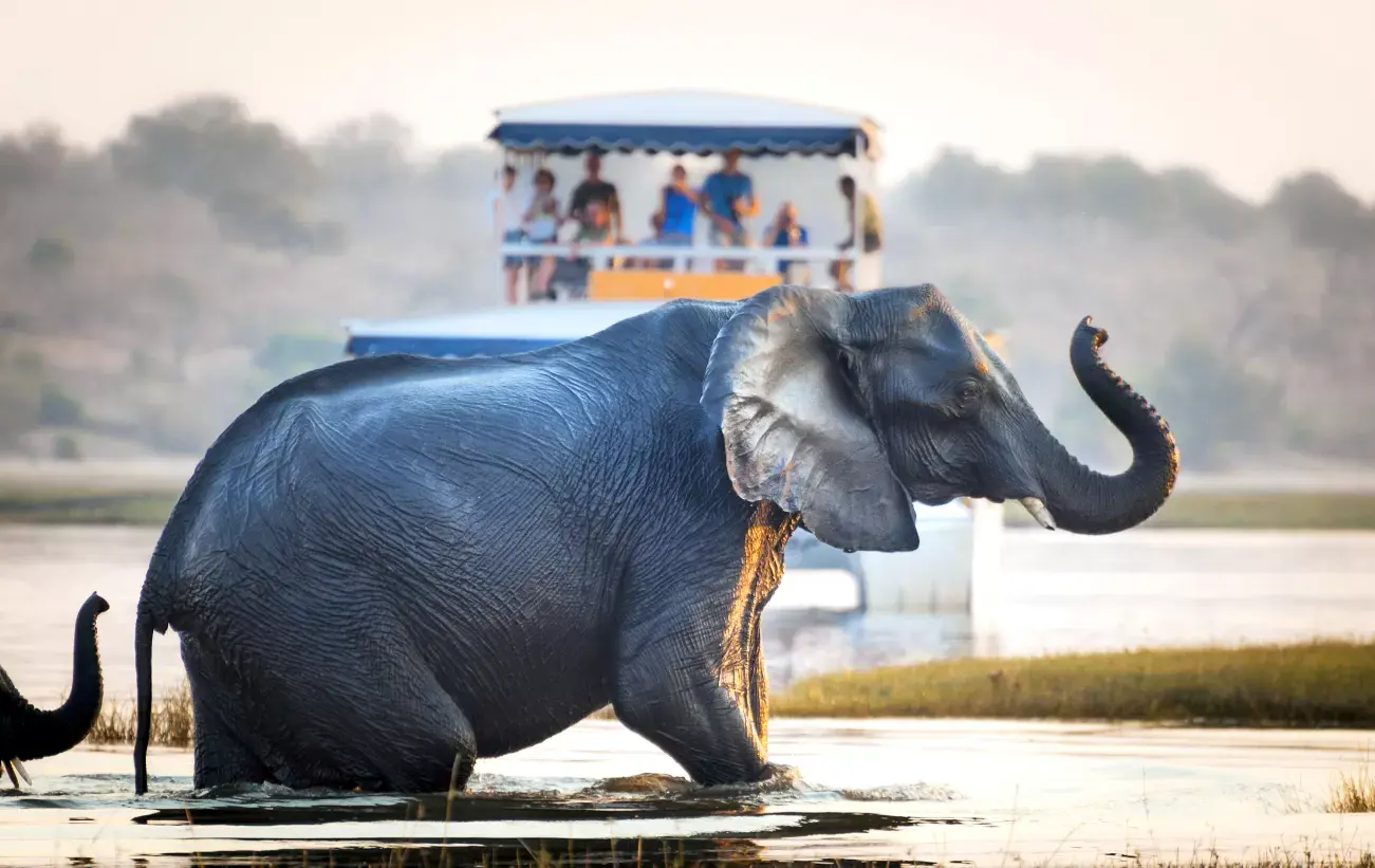 Na parte da tarde, você embarca em uma das experiências mais encantadoras da região: o cruzeiro pelo rio Chobe. Com um refrescante gin tônica em mãos, você terá o privilégio de observar elefantes, hipopótamos, crocodilos e uma variedade de outras espécies que vêm ao rio para beber e se refrescar. Esse verdadeiro oásis é um espetáculo vibrante de vida, e o pôr do sol no Chobe é inesquecível. As cores intensas do céu se refletem nas águas calmas do rio, criando um cenário perfeito para capturar fotos extraordinárias. Certifique-se de que há espaço suficiente na sua câmera ou celular, pois você certamente tirará muitas fotos!